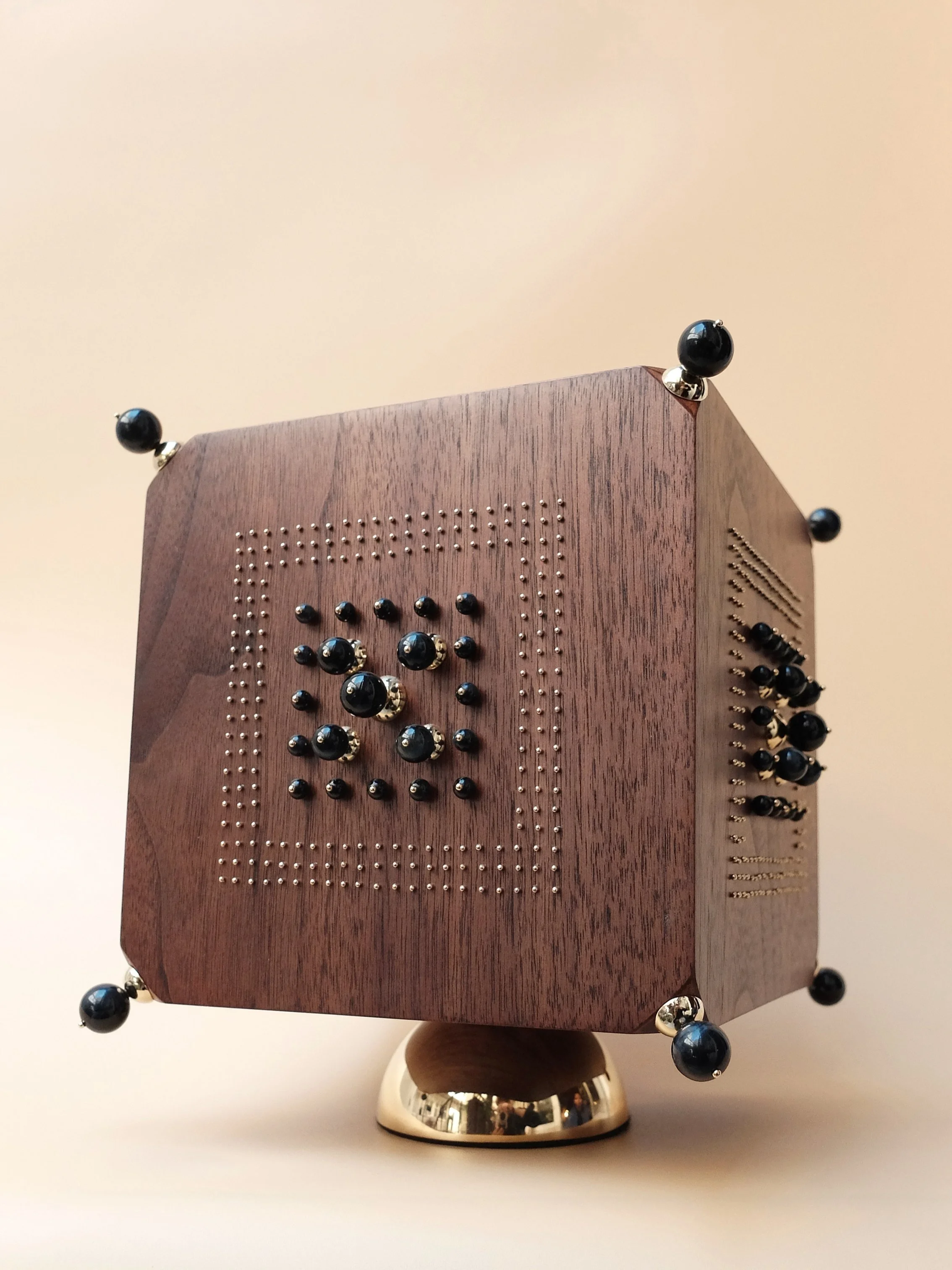 Pièce d’élégance réalisée en Sycomore sublimé par des épingles plaquées or et pierres nommées oeil de faucon.