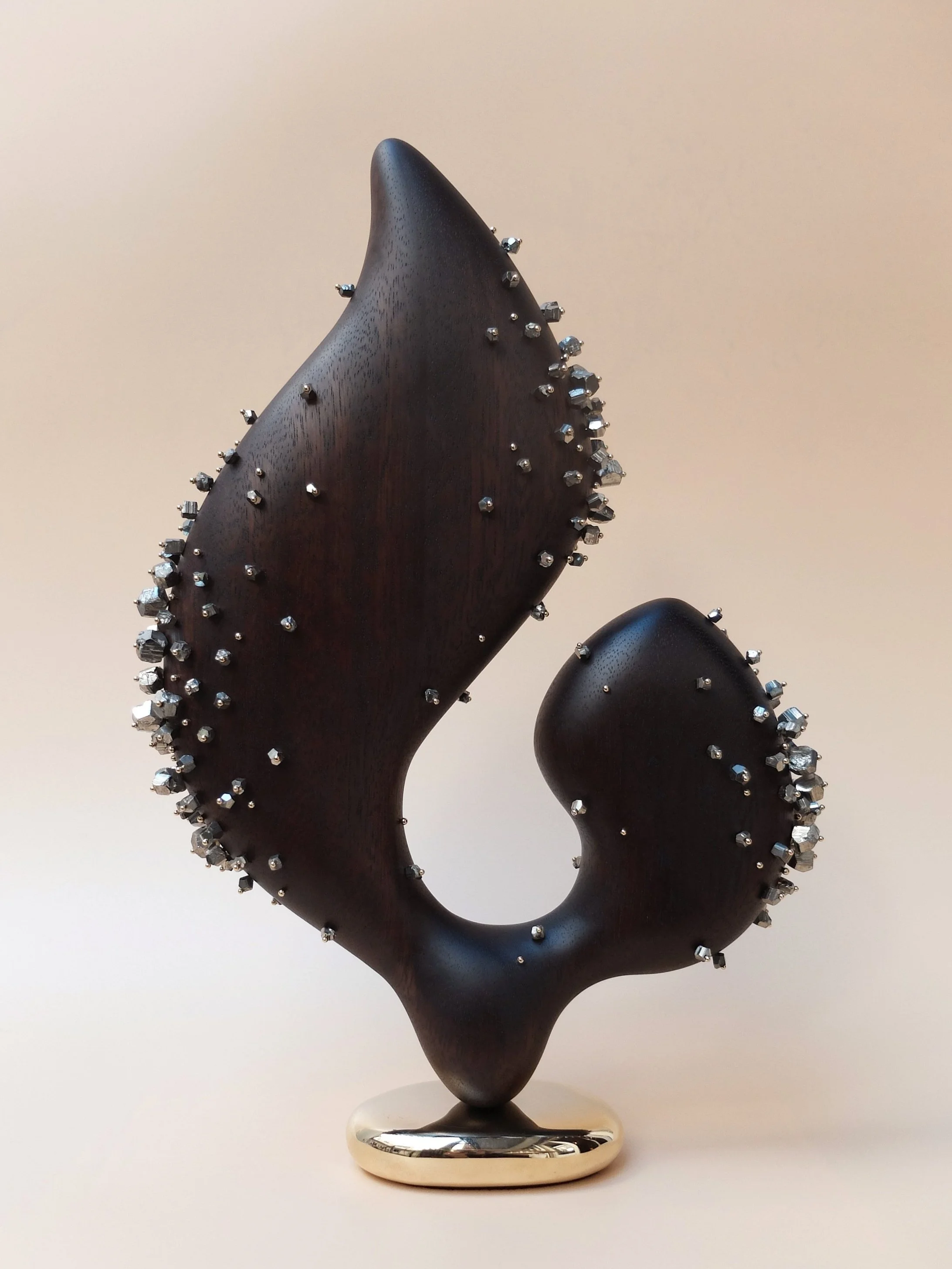Objet d’élégance, sculpture en bois réalisée en bois de noyer sublimé par des cristaux de bismuth et pierres de soleil du Brésil piquées d’épingles plaquées or.