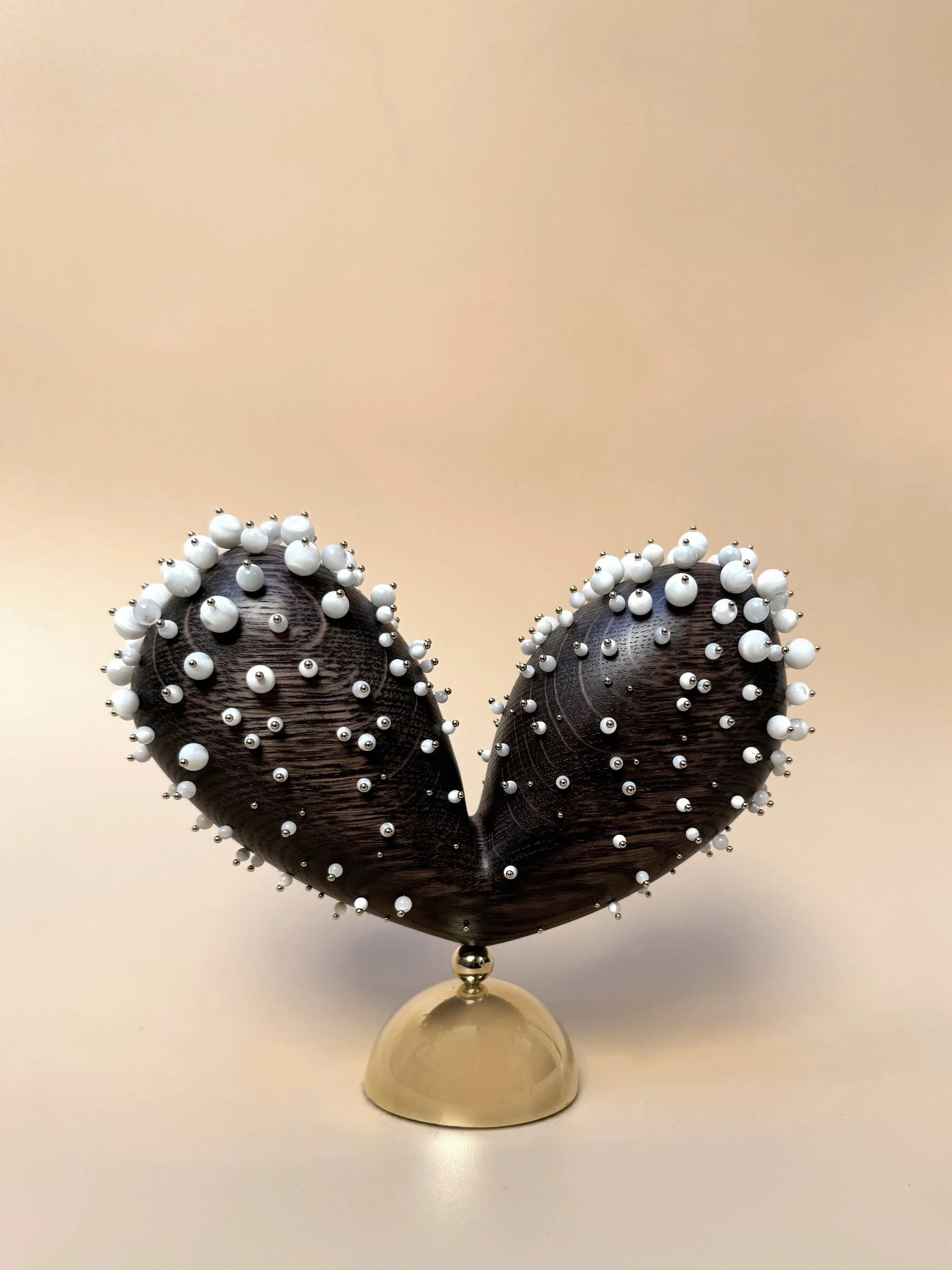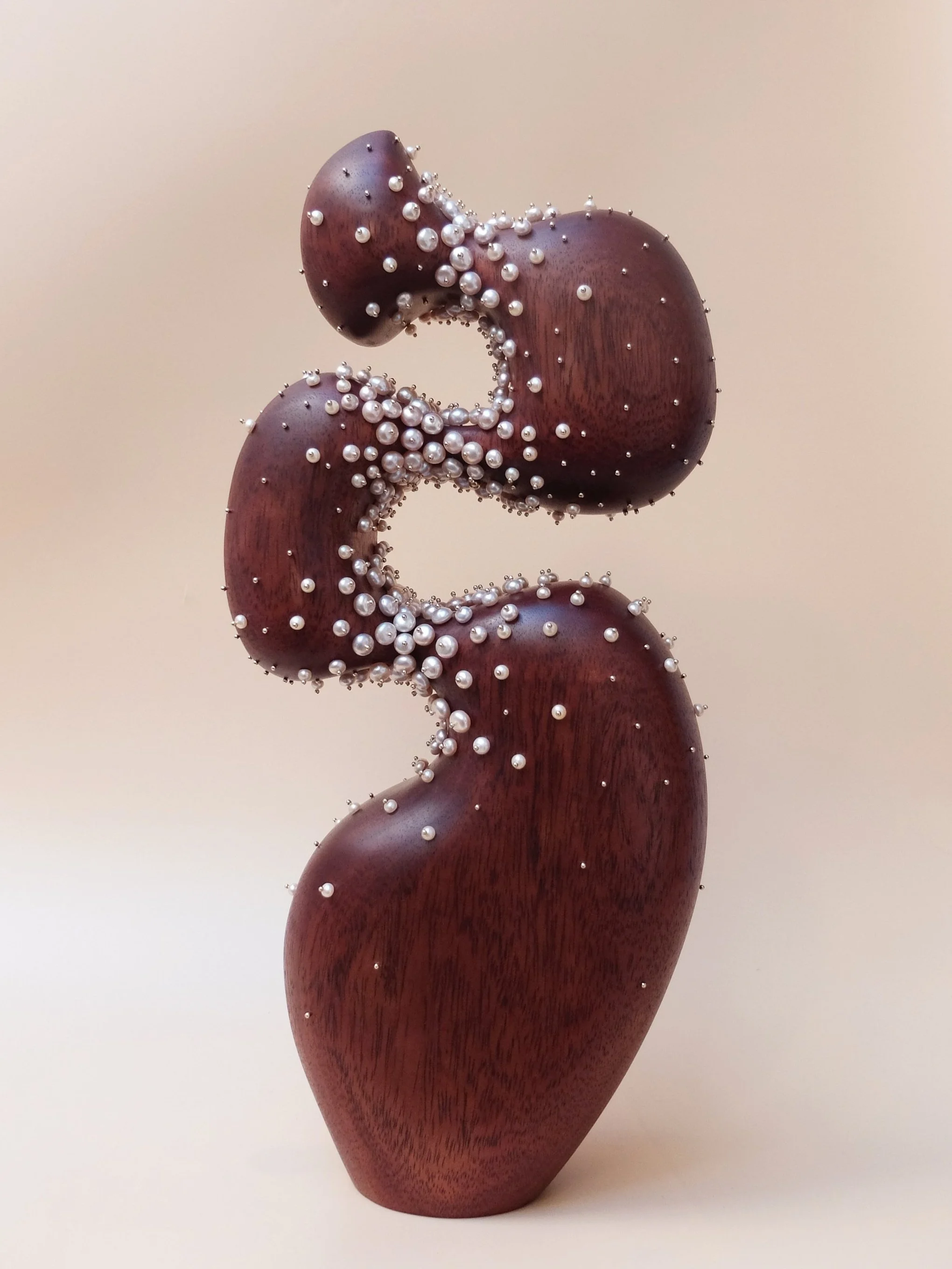 Object of elegance, a wooden sculpture made of sapelli enhanced by cultured pearls studded with gold-plated pins.